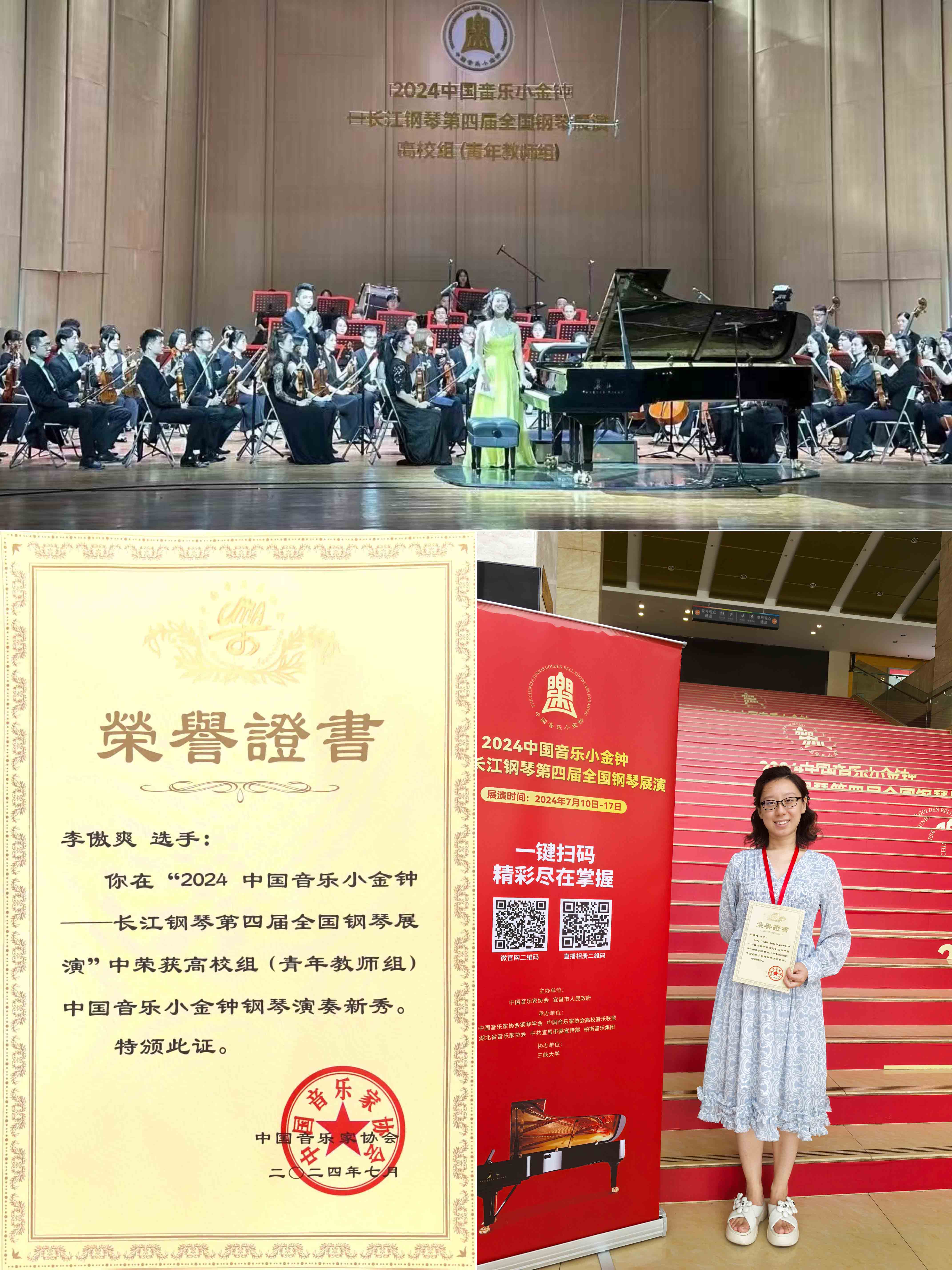 在刚刚落下帷幕的2024中国音乐小金钟——长江钢琴第四届全国钢琴展演中,我校六合彩app下载 青年教师李傲爽以卓越的艺术表现力和精湛的演奏技巧从众多参赛选手中脱颖而出,取得全国第三名成绩,荣获高校教师组钢琴演奏新秀(二等奖)。